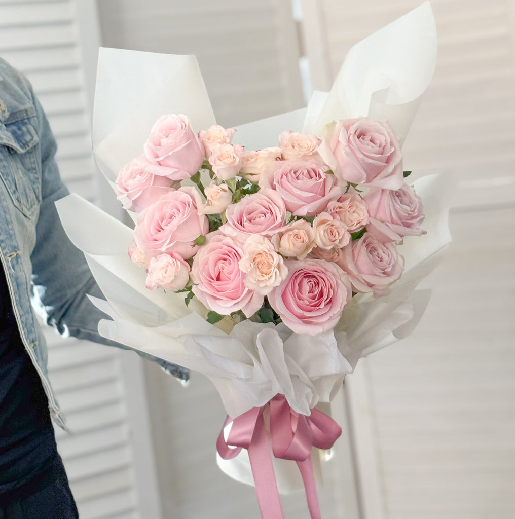 Delicate, graceful, and beautifully romantic, the Soft Blush Promise bouquet captures the essence of gentle love and heartfelt emotions. Featuring 10 light pink roses paired with matching light pink spray roses, this arrangement symbolizes admiration, sweetness, and lasting affection.